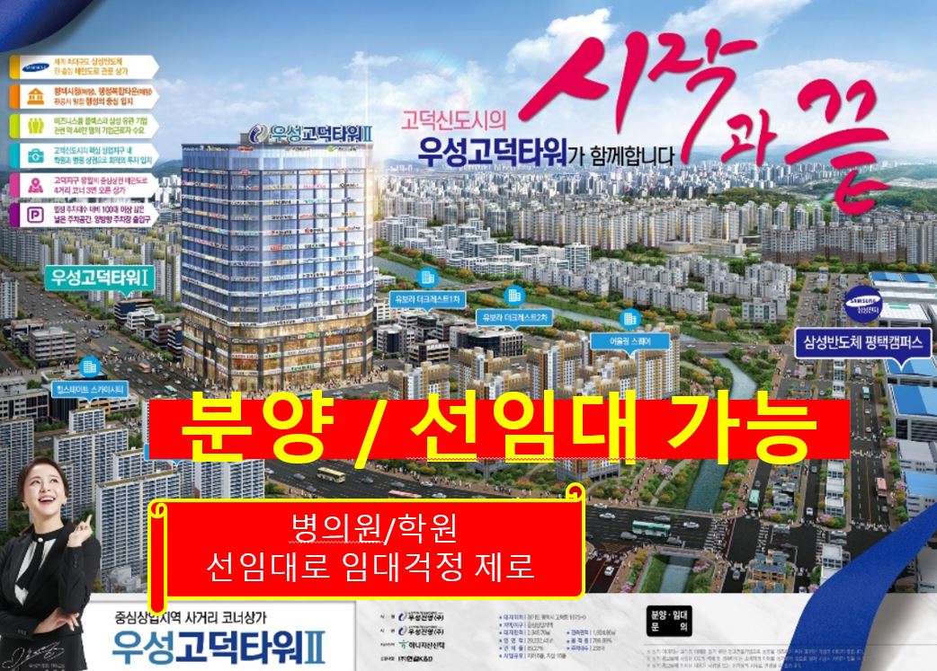 오늘은 평택고덕신도시 중심상업지역 사거리 코너에 위치하여 특별한 투자 가치를 지닌 상가 매물을 소개해 드리고자 합니다. 많은 분들이 주목하고 있는 고덕신도시의 핵심 입지, 바로 고덕 중심상업지구 내 '우성고덕타워2차' 상가 시행사 보유분 분양 매물입니다.