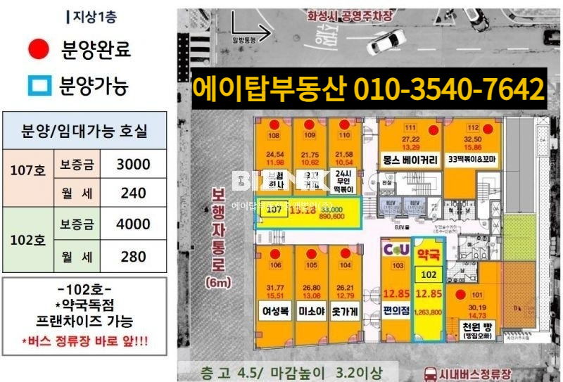 버스정류장 바로 앞, 유동인구 자연 유입으로 가시성과 접근성 모두 우수하며 특히 약국의 경우 사실상 독점 입지로 평가되며, 병·의원 개설 시 동반 시너지 효과도 기대할 수 있습니다.