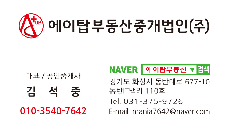 동탄2 신도시 에서 물류센터, 상가, 지식산업센터, 토지를 주 업무로 영업하는 에이탑부동산중개법인(주) 입니다.